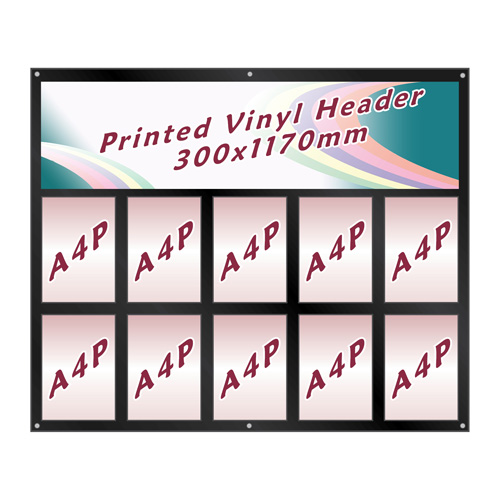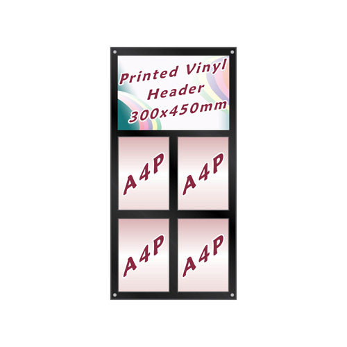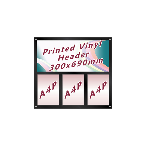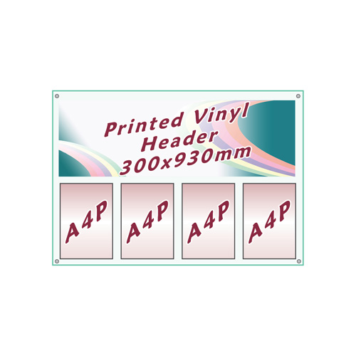 The only difference is that the top row of poster holders is replaced with a vinyl header, printed or cut to your own design.